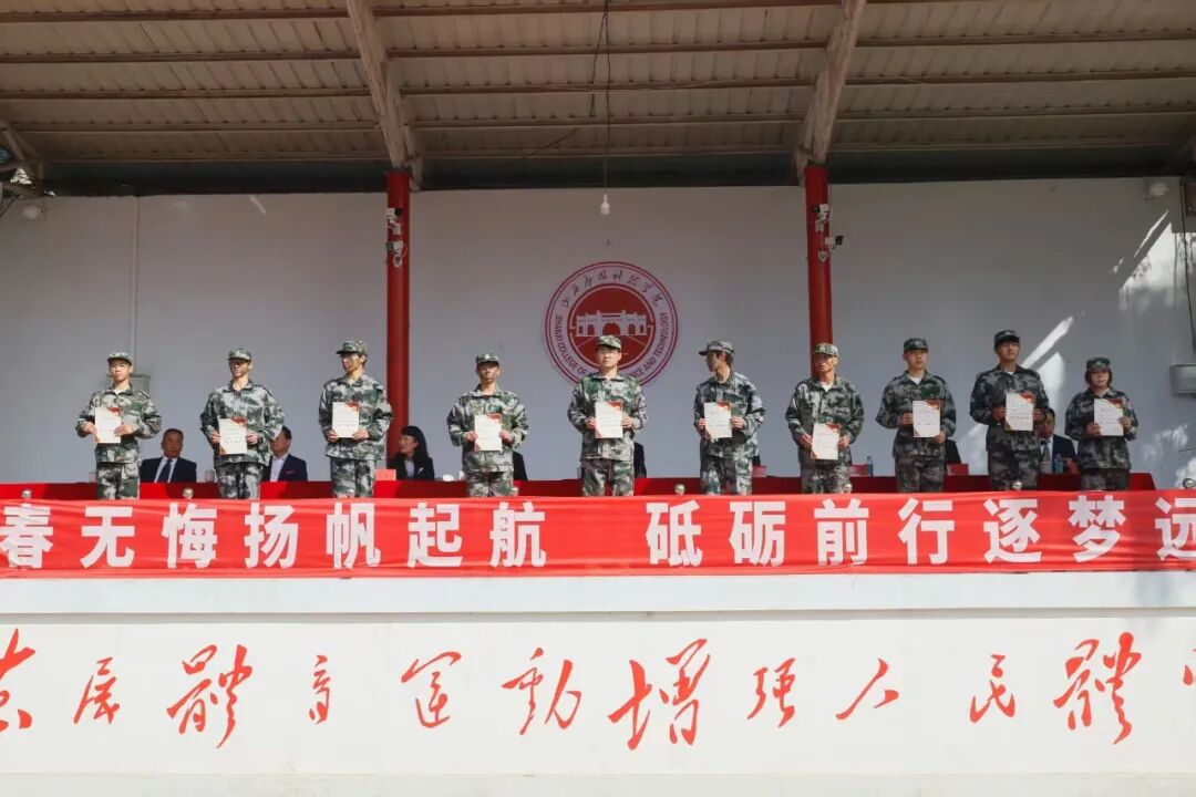 副校长韩如成宣读了《关于表彰2025级专科新生军训先进集体和优秀个人的决定》。本次军训共评选出军训标兵代表、优秀教官、优秀指导员、优秀宿舍和优秀连队等多个奖项。在奋进的音乐声中,主席台领导为受到表彰的团队和个人颁奖。