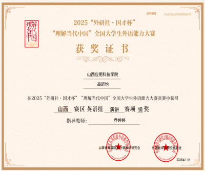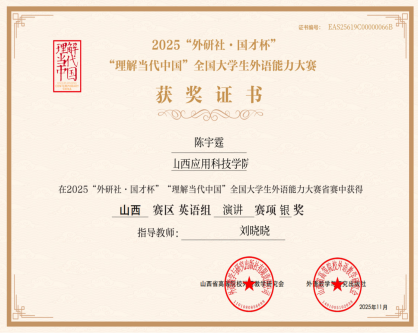 11月1日,2025年“外研社·国才杯”“理解当代中国”全国大学生外语能力大赛山西省复赛圆满落幕。我校基础教学部樊宪辉、乔婷婷婷老师带队的三名选手——信息工程学院陈宇霆同学、贾亦萱同学、建工学院高昕怡同学创下“两银一铜”的优异成绩,为学校赢得了荣誉。