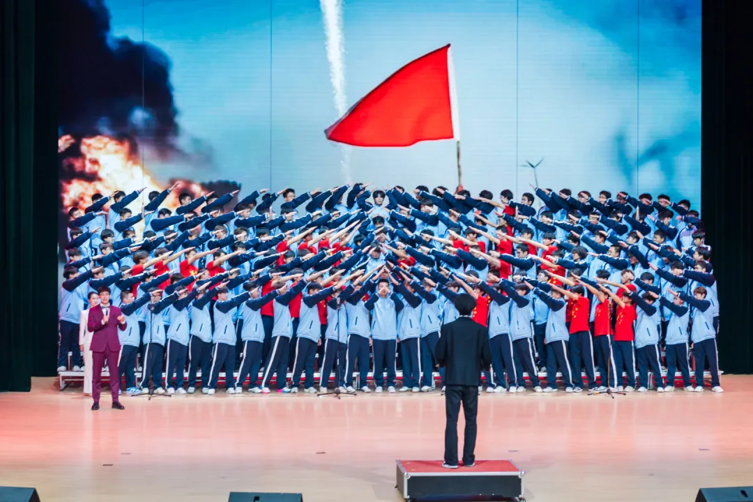 南校区学子身着校服,却用红色的国旗T恤在队伍中摆出了“一二•九”造型,与本次活动主题相呼应。在自选曲目《人民军队忠于党》中,8名战士在红旗的指引下高声朗诵,歌唱声与背景PPT中时代变革以及学子们的手势变化自然融合,表达了南校区学子对党的赤诚之心。