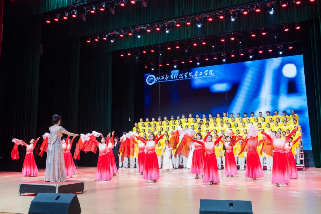 建工学院学子带来的自选曲目《我爱你中国》中,朗诵、领唱、舞蹈、造型变化等各个元素完美融合。演唱队伍的黄白服装与舞蹈者的红白裙装使得整个舞台色彩协调一致,最后舞者用扇面呈现的花面造型表达了建工学子对祖国的深情祝福。