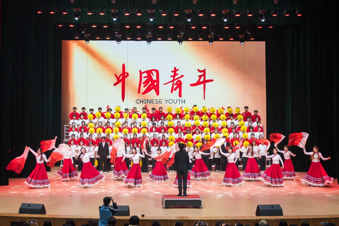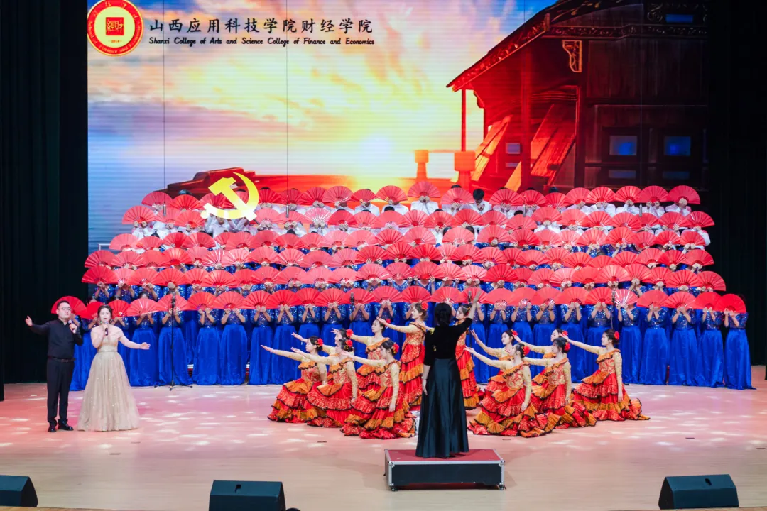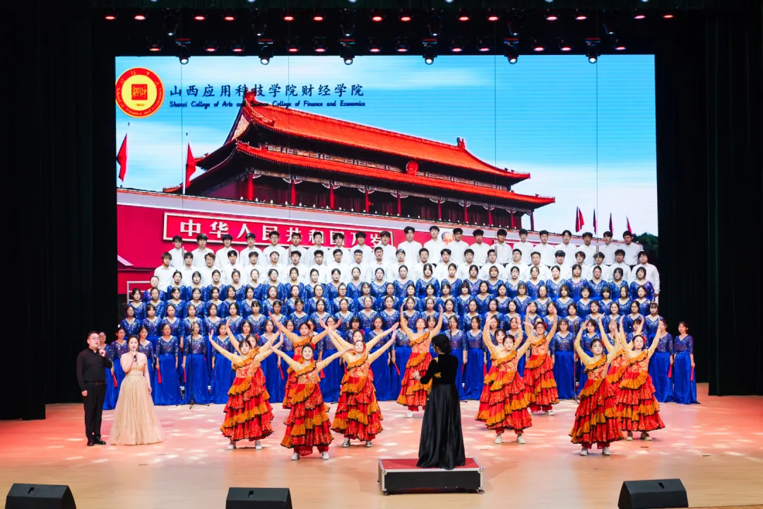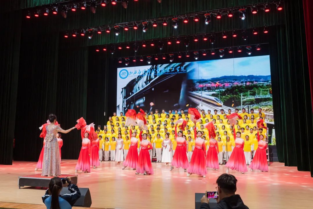 音乐学院学子在校歌和自选曲目《保卫黄河》的演绎中用专业的演唱和精湛的舞蹈为科院师生带来一场视觉和听觉盛宴。音乐学院女生身着绛红渐变长裙,如燎原星火般热烈;男生身着白色衬衫,尽显青年的挺拔与赤诚。在校歌声中,他们唱响了对母校的深情;在《保卫黄河》的铿锵鼓点中,他们以轮唱、齐唱的形式重现经典,“风在吼,马在叫,黄河在咆哮”的呐喊响彻剧场,仿佛将观众带回那段山河激荡、全民抗敌的峥嵘岁月,传递出先辈的不屈与当代青年的担当。