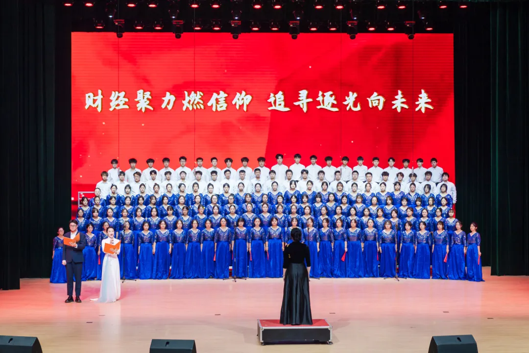 财经学院学子身着白色、蓝色服装,色彩亮丽。在自选曲目《追逐》的演绎中,将党徽、朗诵、萨克斯演奏、舞蹈、国旗、院旗、队伍中扇子变化、男女领唱等多重元素按照歌曲的主题、音乐旋律变化、情感递进等层层深入表现,表达了财经学子对光明和真理的不懈追逐。