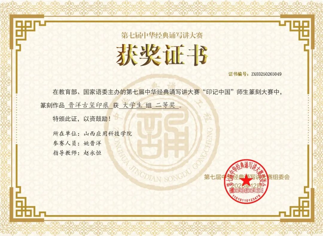 国赛中,张慧老师获评国赛优秀指导教师。赵永恒老师指导的姚晋洋同学,篆刻作品《晋洋古玺印痕》成功斩获“印迹中国”国赛奖项。