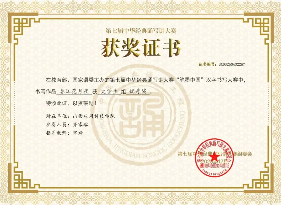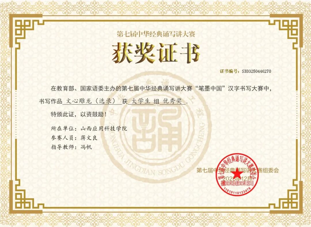 第七届中华经典诵写讲大赛是传承中华优秀语言文化的国家级重要赛事。我校美术学院师生连续取得突破,是美术学院坚持以赛促教、以赛促学,重视实践教学与传统文化传承的成果,充分展现了书法专业扎实的教学水平与师生昂扬向上的精神风貌。