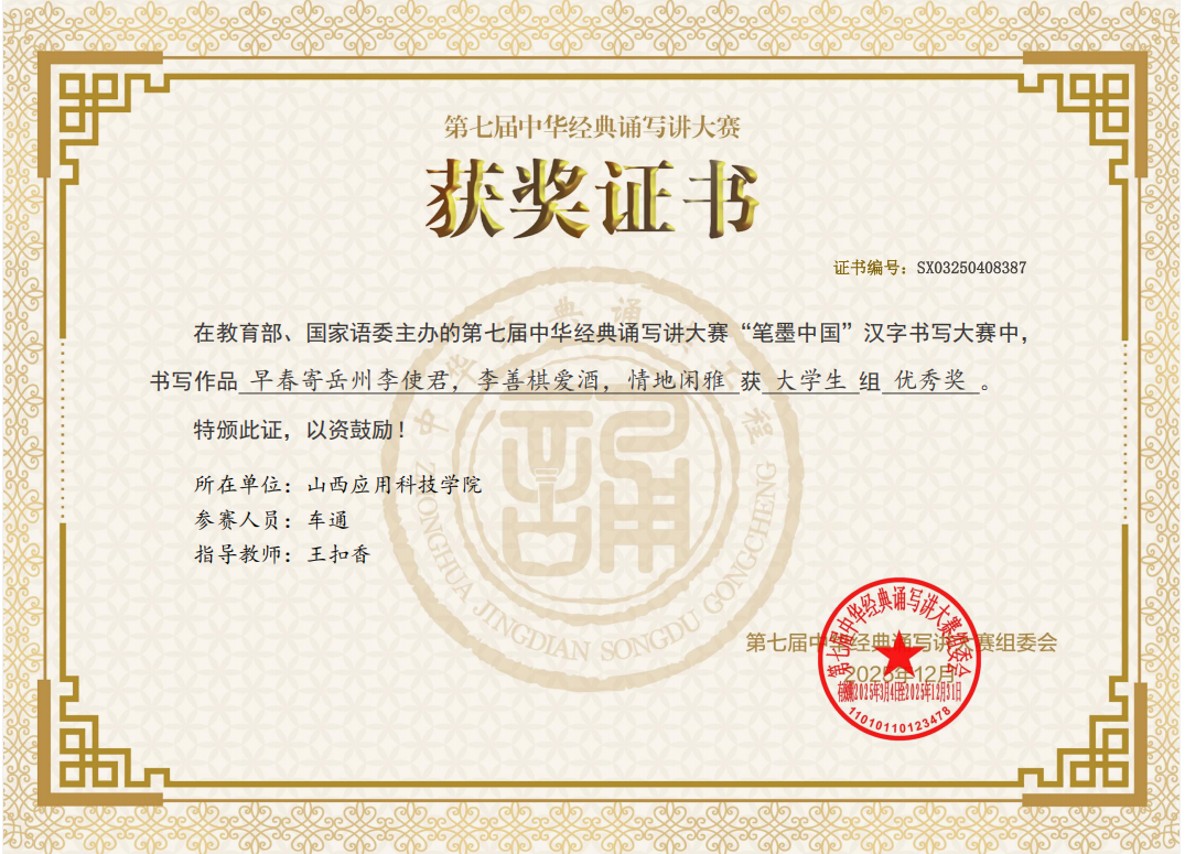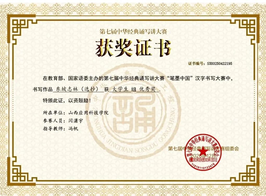 近日,由教育部、国家语言文字工作委员会主办的第七届中华经典诵写讲大赛圆满落幕。我校美术学院师生凭借深厚专业功底与卓越创作能力再创佳绩,斩获国家级奖项7项、省级奖项32项,为学校赢得荣誉。