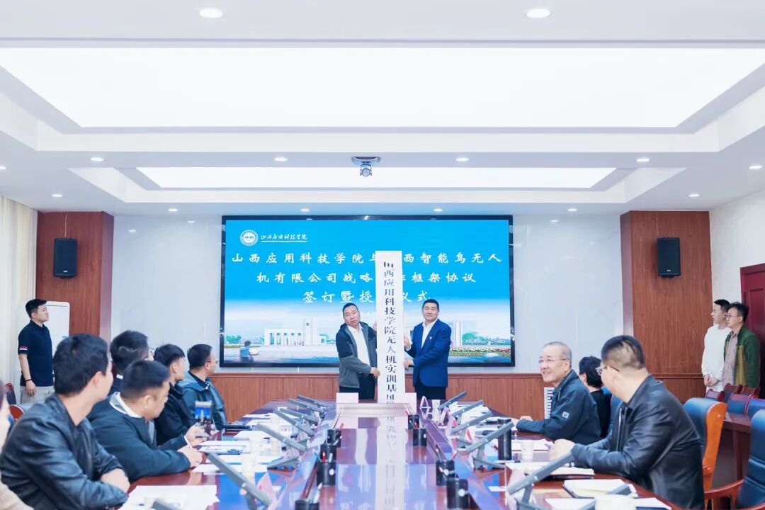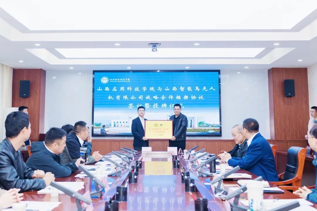 在庄重而欢快的音乐声中,学校执行校长迟云平与山西智能鸟无人机有限公司总经理李然作为双方代表,签署战略合作协议,并向企业授予“山西应用科技学院无人机实训基地”牌匾。校长助理宋煜代表学校接受企业授予的“无人机技术与应用产学研基地”牌匾。现场掌声热烈,将仪式推向高潮的同时,标志着双方合作进入实质性落地阶段。