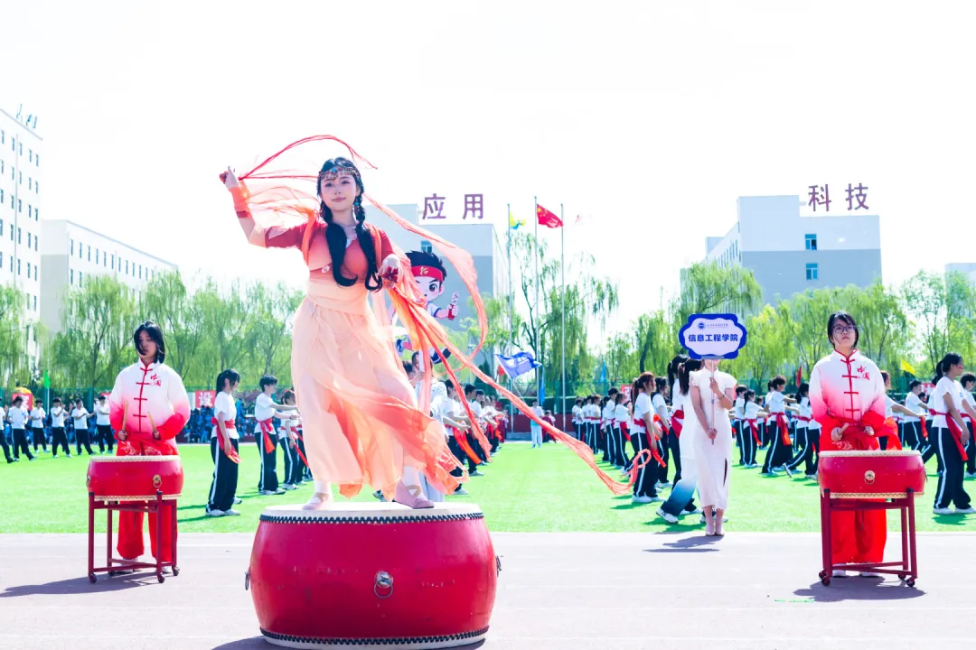 开幕式上,伴随着激昂的《运动员进行曲》,国旗护卫方阵以铿锵步伐拉开序幕,鲜红的五星红旗与校旗、校徽交相辉映,凝聚着科院人对家国的赤诚与对学校的热爱。教师裁判员方阵以专业姿态入场,承诺为赛事公平保驾护航;各学院代表队紧随其后,以创意表演诠释“大健康”理念与“拓荒”精神的深度融合。信息工程学院以《龙拳》武术与跳绳表演展现工科少年的活力与坚韧;建工学院通过五件建筑模型演绎“三三精神”,彰显务实与创新并重的健康态度;动力学院将武术与太极二十四式相结合,诠释“拓荒精神”中刚柔并济的体育哲学;财经学院以数据流转的队列变换展现严谨与激情的平衡;管理学院手捧七色花,以自信舞姿致敬科院热土;音乐学院以琴音与歌声传递青春力量;美术学院以画笔为马,用色彩勾勒健康生活的美好图景;文化传媒学院则通过朗诵与舞蹈,将科院35年发展历程融入艺术表达。南校区代表队以“团结为旗、拼搏为剑”的誓言,展现新时代青年以健康体魄投身学校发展的决心。