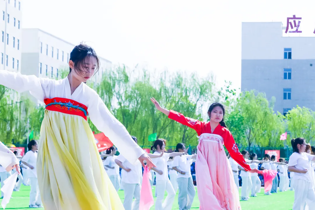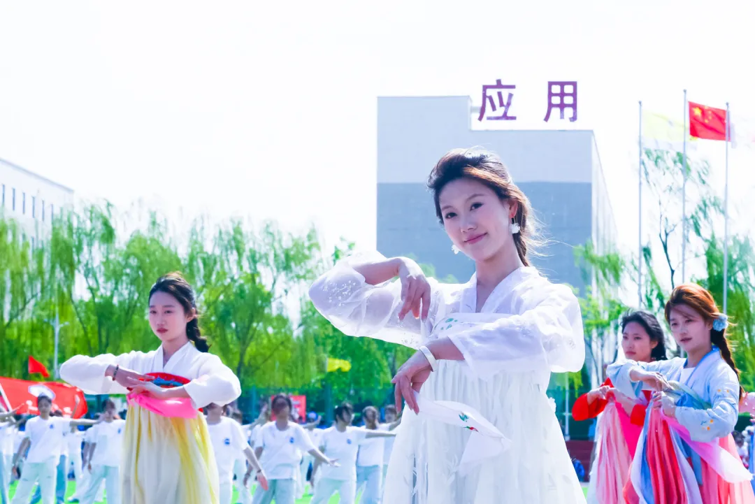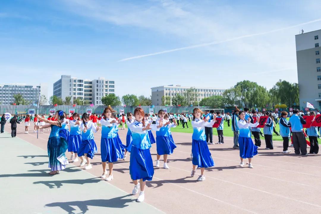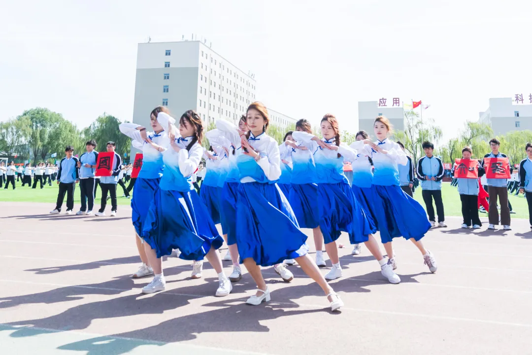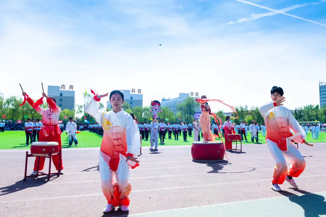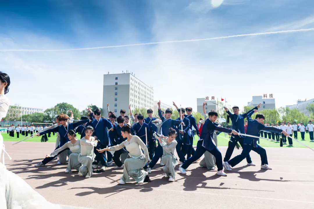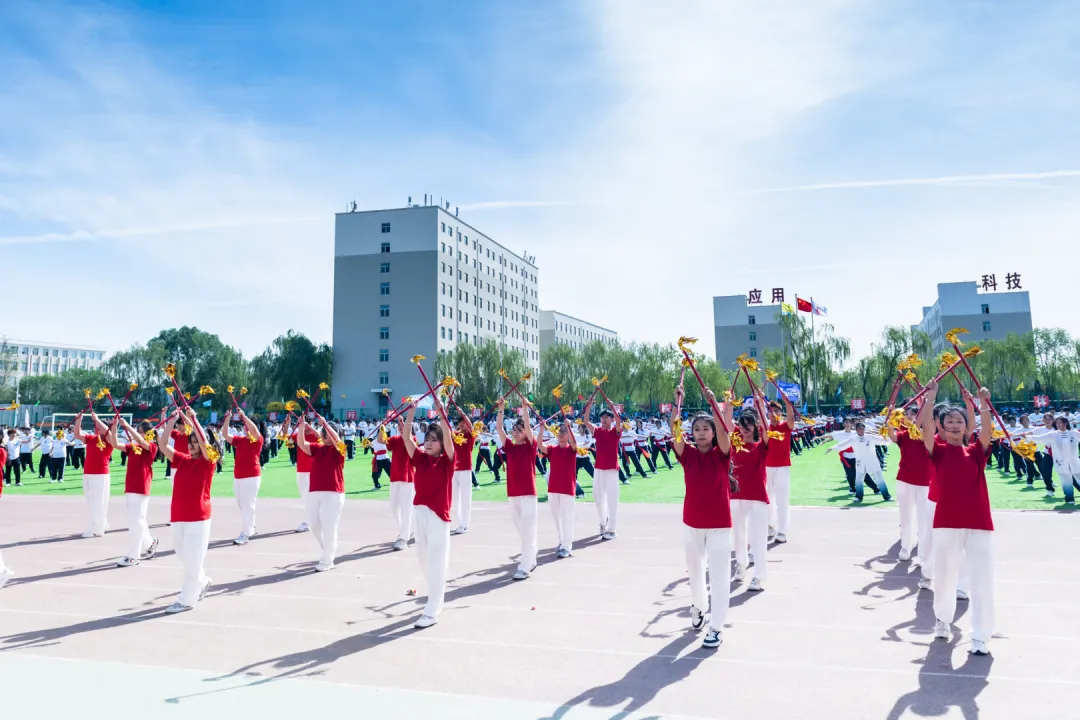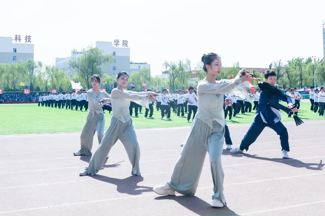 团体操表演将开幕式推向最高潮。文科组(管理学院与财经学院)以太极与队列开合展现协作力量,衣袂轻扬间勾勒晋商谦和笃行的健康风骨;工科组(动力学院、信息工程学院、建工学院)以醒狮腾跃、霸王鞭舞、太极二十四式等方式诠释刚柔并济的体育精神,建工学院更将省级非遗“霸王鞭”搬上赛场,展现太行民俗中健康生活的智慧传承;艺术组(美术学院、音乐学院、文化传媒学院)以太极剑、朗诵、舞蹈等多元形式,将东方美学与青春风采完美融合,为校庆献上最真挚的祝福。